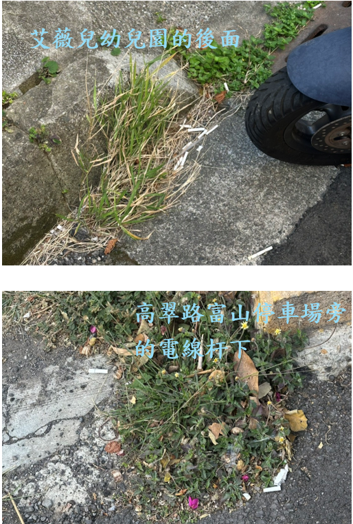在這步伐很快的世代,許多人都會藉著抽菸來緩解壓力,也有許多人會邊走路邊吸菸,而抽完的菸蒂不知該往哪丟,就選擇直接丟在路邊的花叢或水溝,如果菸沒完全熄滅就有可能會引發火災,在高翠路的路邊就有看到許多的菸蒂,艾唯兒幼兒園的後面地面上也有許多的菸蒂,前面的公園旁也有許多的菸蒂,不只有高翠路的路邊有,新竹市的路邊幾乎都有菸蒂, 因此提出此案,加強路面的菸蒂清潔。