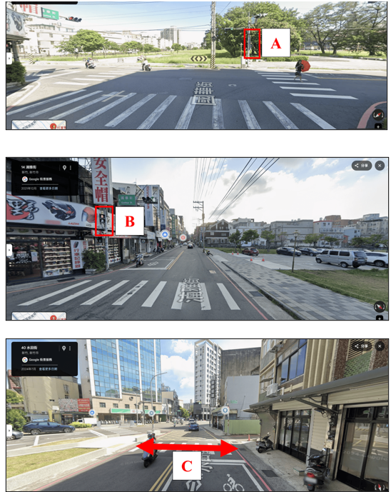 一、請市府在圖中B的對面新增行人號誌燈,維持雙邊皆有行人號誌燈可以觀看。